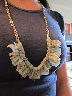 Last of all, on this ruffle-theme, I took a chain I found on the $1 table at the Sac Antiques Fair, and some scrap fabric and finally completed a project I had bookmarked ages ago from http://lillyella.blogspot.com Pretty straightforward project, but I really like the combination of soft fabric with chunky chain.